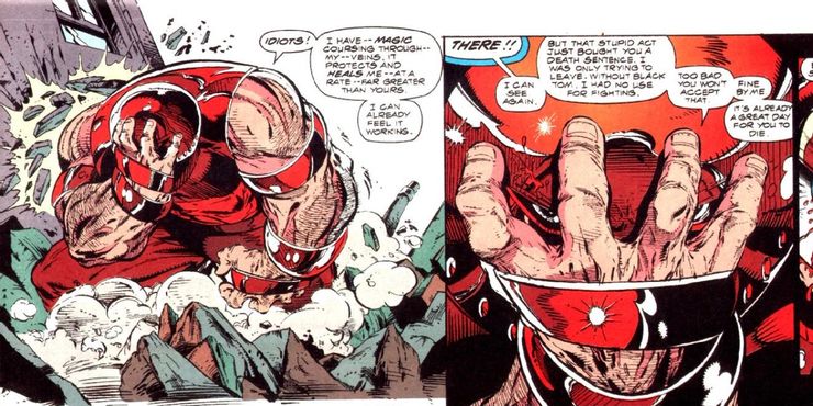 Predominantemente conocido por su fuerza física cruda y su increíble durabilidad, a los lectores les resultará fácil olvidar que el rubí místico de Cyttorak también imbuye a Marko con los poderes de regeneración. El icónico casco y la armadura de Juggernaut pueden protegerlo de algunos ataques indudablemente devastadores, pero de vez en cuando en un mientras que, ya sea su principal defensas están comprometidos o se cuela un golpe de suerte. Es en estos momentos más raros cuando los lectores tienen la oportunidad de ver la asombrosa magia curativa de Cyttorak en acción.