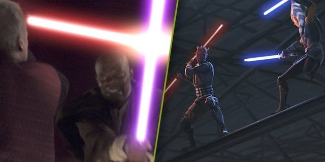 Los episodios finales de Guerra de las Galaxias, la guerra de los clones se llevan a cabo al mismo tiempo que los eventos de Star Wars: La venganza de los Sith. En el episodio “Viejos amigos no olvidados”, Obi-Wan Kenobi y Anakin Skywalker se fueron para rescatar al canciller Palpatine del conde Dooku. En el episodio más reciente, “El aprendiz fantasma”, Obi-Wan le informa a Ahsoka Tano que Anakin mató a Dooku. Ahsoka permaneció en Mandalore para buscar a Darth Maul y, al final del episodio, encontró al descarriado aprendiz Sith. Tuvieron un duelo que comenzó en la sala del trono de Mandalore y pronto progresó afuera. Dado el momento, un fanático imaginó este duelo al mismo tiempo que otro de Venganza de los Sith.
