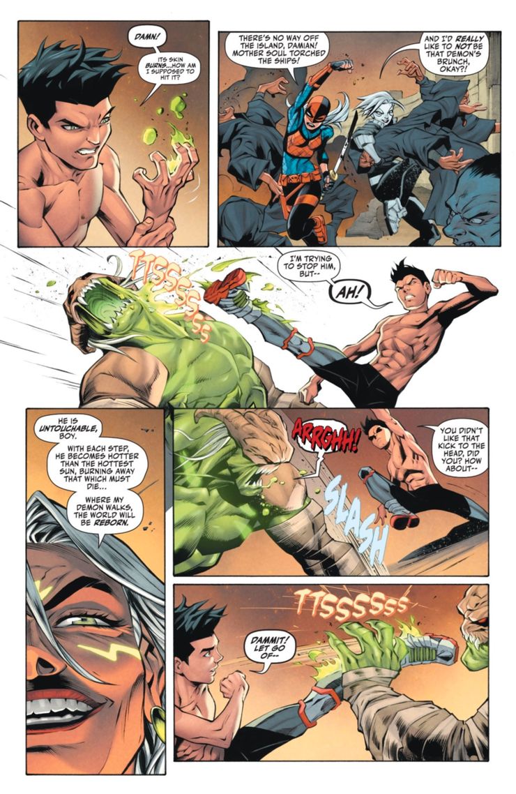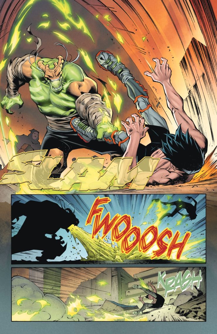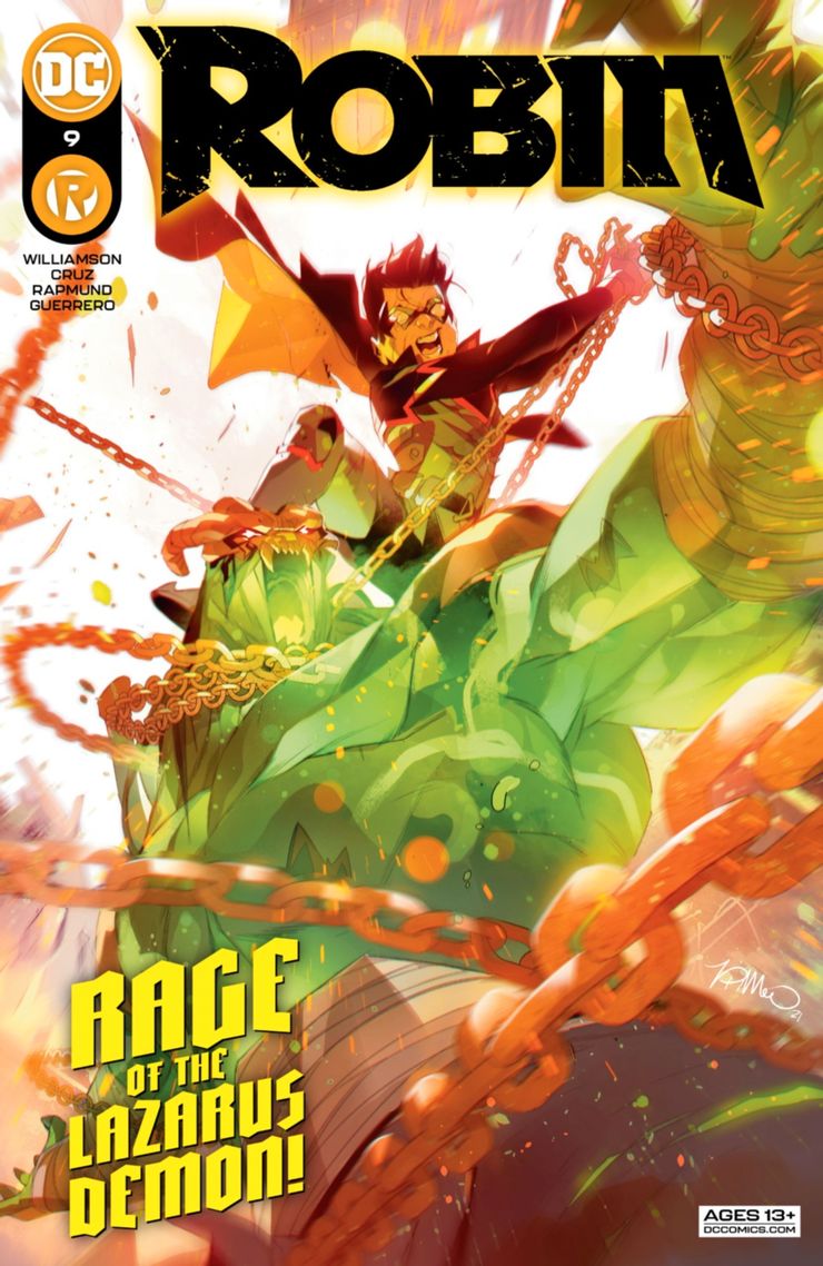 Las páginas de vista previa para Robin # 9 retomar después del emocionante suspenso en el último número. El Torneo Lazarus terminó y aunque Damian luchó valientemente, perdió ante su mayor oponente en el concurso, Connor Hawke. Desafortunadamente, la inmortalidad prometida para el vencedor viene con condiciones y lo único que Connor ha ganado es la oportunidad de ser el anfitrión del Lazarus Demon de Mother Soul. Planeando enviar a su monstruo para quemar el viejo mundo y prepararse para el nuevo, Soul confía en que los ataques de Damian contra el demonio de Lázaro son en vano, y observa con júbilo cómo el chico es golpeado. Damian yace golpeado, disculpándose por su fracaso hasta que escucha palabras de aliento de una voz familiar.