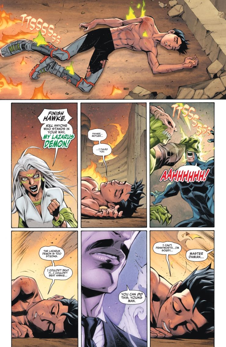 La sorprendente muerte de Alfred ocurrió a manos de Bane en Batman # 77 por Tom King, Mikel Janin y Tony S. Daniel. El evento pesa mucho en el corazón de Damian, quien se culpa a sí mismo por la muerte del fiel mayordomo después de que su intento de rescatar a Alfred terminó con Bane matándolo frente al joven. Ser testigo de la muerte violenta de Alfred fue el primer paso en una serie de eventos que hicieron que Damian abandonara el papel de Robin y lo pusiera en el camino que lo llevó a la competencia de lucha clandestina, el Torneo Lazarus.