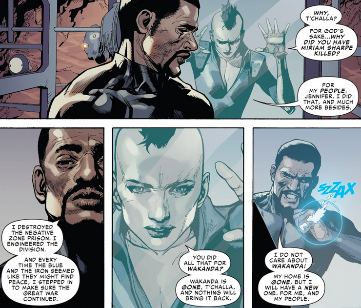 Después de que Miriam Sharpe es asesinada tratando de organizar conversaciones de paz entre el Capitán América y Iron Man, Stark envía a She-Hulk a localizar al asesino. Su camino la lleva a descubrir que durante los últimos seis años todo el conflicto ha sido manipulado por Black Panther, quien se presume muerto después de la destrucción de la prisión de Stark. T’challa revela que fue él quien desencadenó la autodestrucción, enmarcando a Iron Man en el Capitán América y viceversa, y que durante los últimos seis años intervino para intervenir cada vez que parecía que había un acuerdo de paz en el camino. tarjetas
