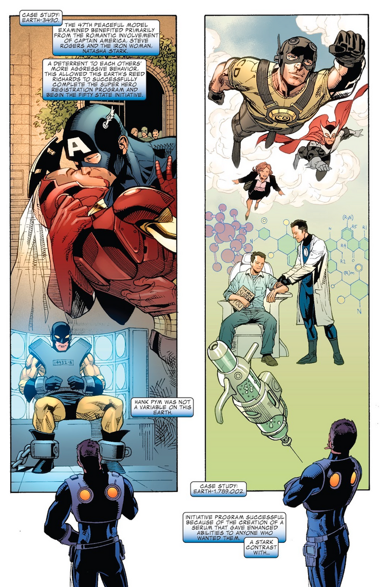 Iron Man apoyó firmemente a la SRA mientras que el Capitán América estaba firmemente en contra; pasó a la clandestinidad junto con sus seguidores de superhéroes y el Guerra civil comenzó correctamente. El evento culminó en una batalla masiva en la que el Capitán América se dio cuenta de que la pelea prolongada entre él y Iron Man no tenía ningún propósito y se entregó voluntariamente (luego sería asesinado por un francotirador después del evento). Pero Reed Richards, en busca de otros resultados a través del Puente, una máquina que le permite ver realidades alternativas, vio un universo en el que el Capitán América y Iron Man resolvieron sus diferencias no con odio, sino con amor. La paz se logró en parte debido a “… la participación romántica del Capitán América, Steve Rogers, y la Mujer de Hierro, Natasha Stark”.