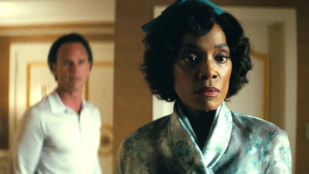 La conversación luego giró hacia su escena final en Polvillo radiactivo El final de la temporada 2, en el que Cooper es arrestado por el Comité de Actividades Antiamericanas de la Cámara de Representantes después de entregar la fusión fría al presidente de los Estados Unidos, interpretado por Clancy Brown, y el Sr. House lo llama por teléfono para decirle que eligió el lado equivocado. Aunque inicialmente se la muestra llorando mientras observa cómo se llevan a su marido, un breve corte muestra al personaje de Goggins diciéndole que haga parecer que todo fue idea suya.para que ella pueda estar allí para cuidar de Janey.