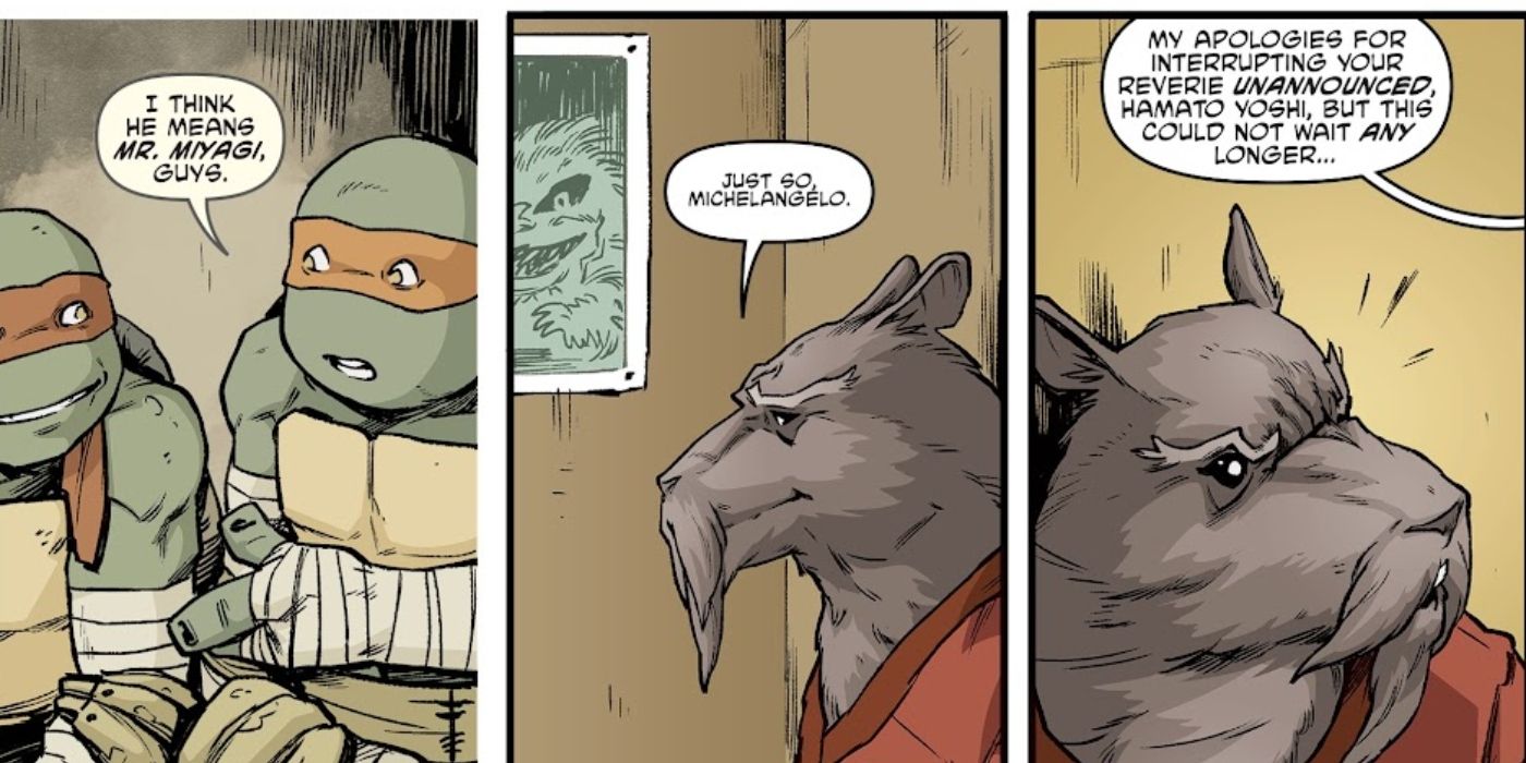 El Sr. Miyagi es quien entrenó a Danny LaRusso en los caminos del Miyagi-Do Karate, lo que lleva a la formación del El niño Karate películas y su eventual metamorfosis en cobra kai. Básicamente, el Sr. Miyagi es parte integral de toda la franquicia, que es algo de lo que el Maestro Splinter no solo es consciente, sino que también se inspira legítimamente. Durante los hechos de este TMNT cómico, Splinter estaba en una encrucijada. Splinter no está seguro de si debe continuar liderando el Clan Foot o volver a vivir su vida de la manera que originalmente pretendía, la forma en que lo habría hecho el Sr. Miyagi. Curiosamente, cuando Splinter piensa en el momento en que nombró al Sr. Miyagi como su artista marcial de películas favorito, recibe la visita de Karai, que quiere hacerse cargo del Clan Foot, ya que es la nieta de Shredder, y Splinter inmediatamente hace el esfuerzo. para comenzar esa transición de poder.