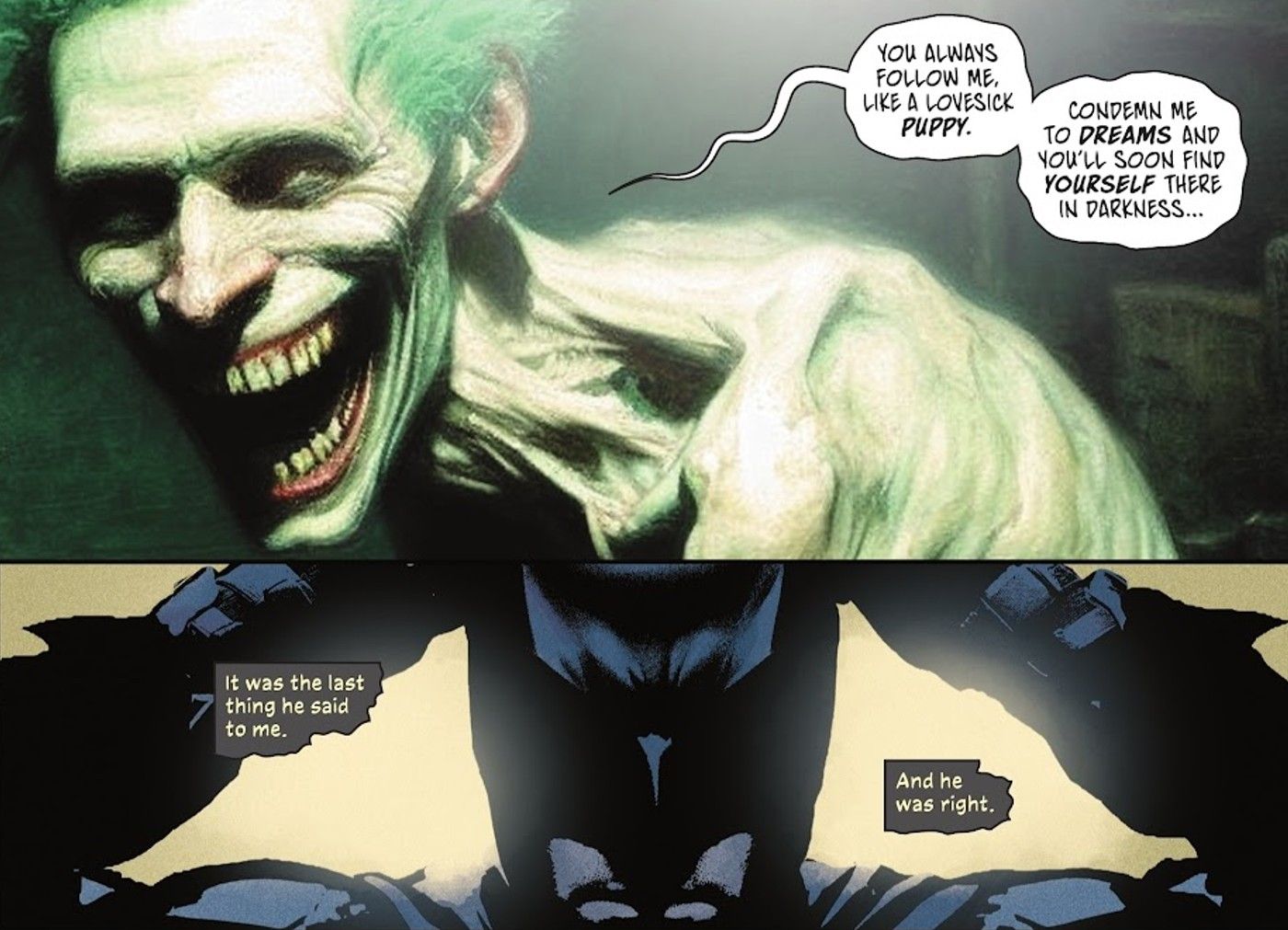 Parte del conflicto entre Batman y el Joker son sus puntos de vista extremadamente diferentes sobre el mundo. Batman cree que el orden puede existir, que la justicia es real y que las personas inocentes deben evitar sufrir daños. El Joker cree que nada importa y que la vida es puro caos. Durante años, el Joker ha intentado justificar su punto de vista ante Batman, lo que ha dado lugar a historias como El chiste asesino de Alan Moore y Brian Bolland, en el que el Joker le pregunta específicamente a Batman “¿Por qué no puedes ver el lado divertido?” Este ha sido un componente importante de su conflicto, y ahora la negativa de Batman a comprender la visión del mundo del Joker es lo que finalmente ayuda a salvarlo.