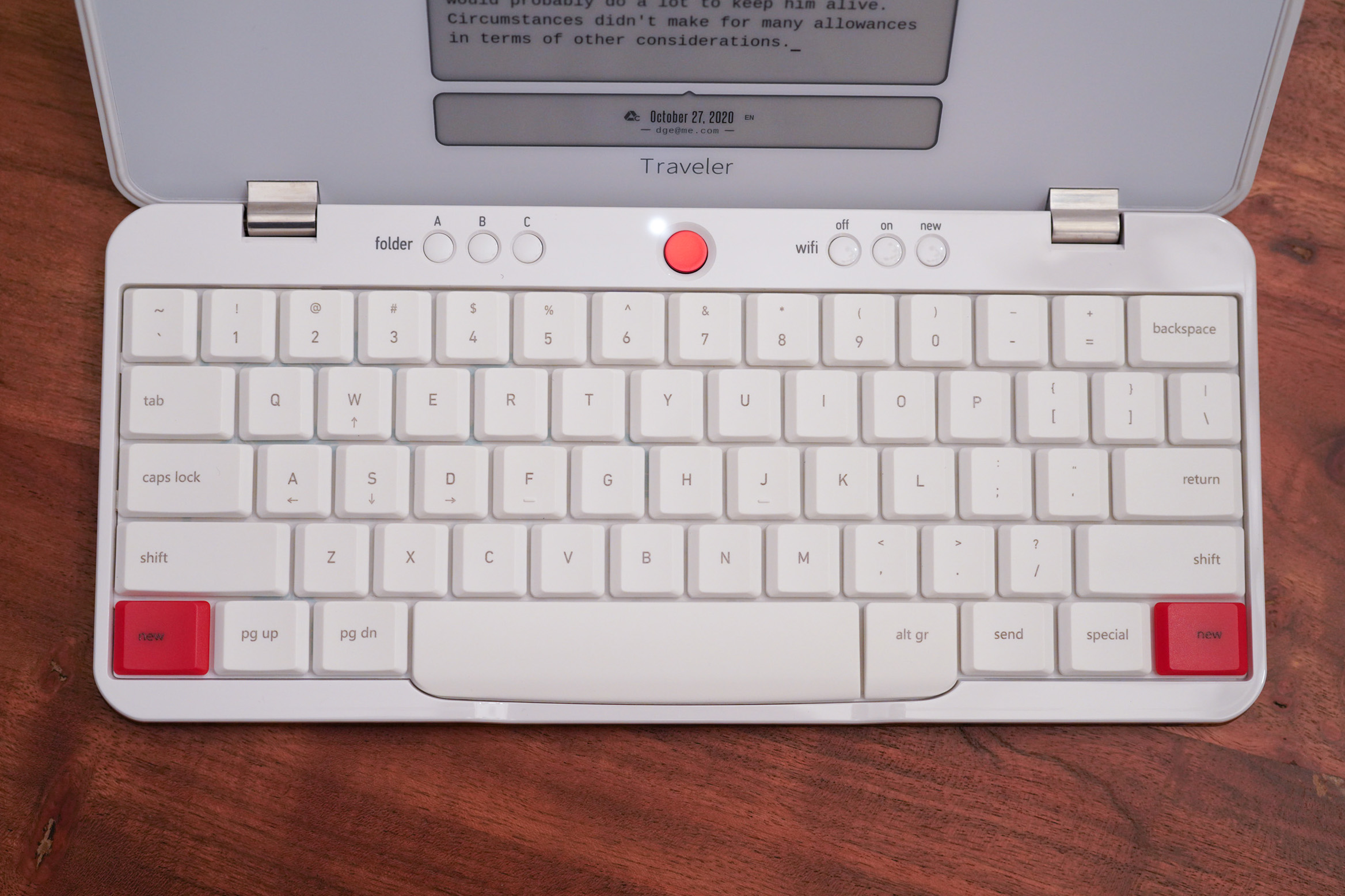 Astrohaus se ha mantenido muy cerca de su visión original del Traveller, con algunos ajustes menores, incluido el diseño de las bisagras. El resultado final es una máquina de escribir digital portátil liviana y duradera, con un teclado que se siente excelente para escribir, mejor que cualquier computadora portátil en mi experiencia. El teclado es realmente la estrella del espectáculo aquí, ya que se trata de un dispositivo especialmente diseñado para escribir. El recorrido se siente amplio, especialmente para un dispositivo de estilo portátil, y los huecos de las teclas redondeadas y elevadas facilitan el uso de la tipografía cómodamente todo el día si lo desea.