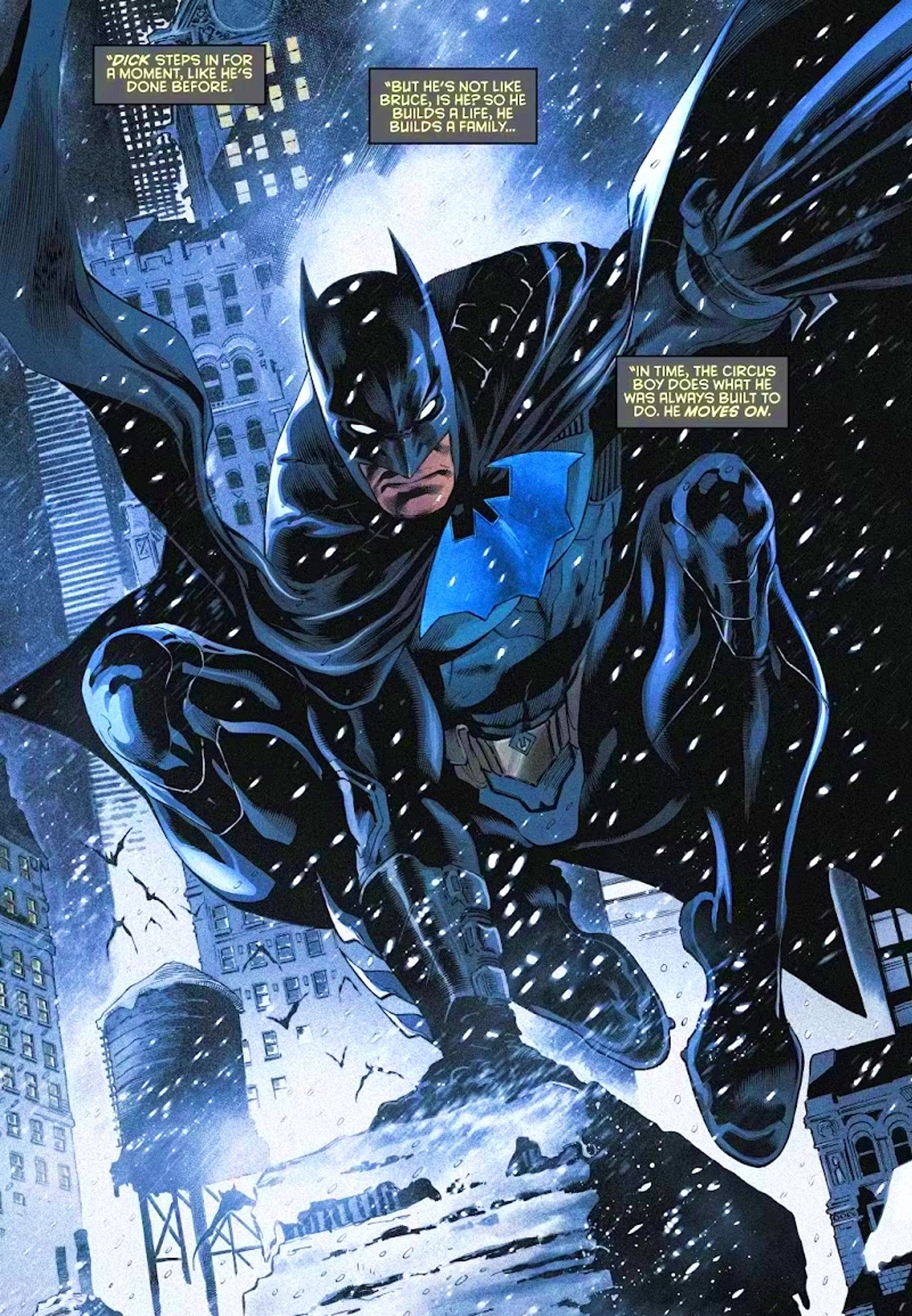 Es por eso que cuando se muestra a Dick Grayson con el traje de murciélago en DCómics efectivos #966, de James Tynion IV y Eddy Barrows, Eber Ferreira y Adriano Lucas, los fanáticos lo ven como una nueva versión de Batman. En el número, Tim Drake regresa del futuro como un Batman violento y perdido en el tiempo que le cuenta al Tim moderno sobre el futuro de la Batfamilia. Después de que Batman cae, Dick es el primero en tomar el relevo, pero a medida que se muestra a los lectores, su disfraz cambia el símbolo del murciélago negro/amarillo de Bruce por un icono azul que recuerda al de Nightwing. Es un detalle pequeño pero asombroso que muestra que, en ese futuro, Dick hace suyo el papel, en lugar de tratar de ser una imitación consciente de Bruce como lo ha hecho en el pasado.