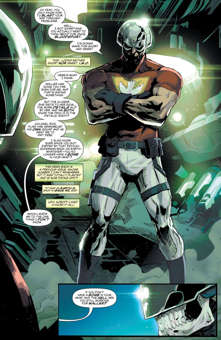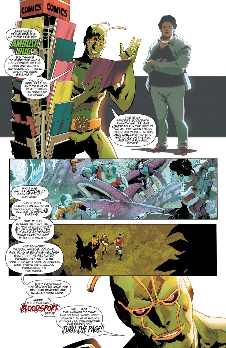 En ediciones anteriores de Escuadrón suicida, se reveló que Bloodsport de Robert Dubois ha estado trabajando para Waller como un explorador multiversal, buscando nuevos mundos mientras captura a varios metahumanos que serían ideales para su nuevo equipo. Si bien esto llevó a un enfrentamiento con el oscuro Superman de Earth-3 conocido como Ultraman donde Dubois casi muere, Waller terminó eligiendo Earth-3 como el mundo que quiere tomar, salvándolo de su propia oscuridad y corrupción. Sin embargo, parece que Rick Flag’s Squad intentará detenerla antes de que eso suceda.