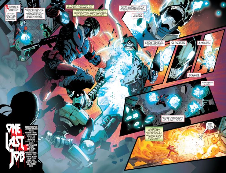 UN ÚLTIMO TRABAJO – ¡ATAQUES DE LA BANDERA DE RICK! El Escuadrón Suicida apenas logra robar una tecnología alienígena de Oa solo para encontrarse aislados de su transporte de regreso a la Tierra y huyendo de Los Linternas y Thanagarianos. Y no hay respaldo proveniente de la Tierra porque Amanda Waller está bajo el fuego de su antiguo aliado y enemigo actual: ¡Rick Flag!