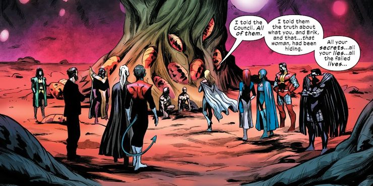 Mientras Magneto y Xavier permanecieron muertos, no estaban involucrados en las manipulaciones políticas de Emma Frost. Una vez que Emma despierta a los dos, deja en claro que tiene “hecho algo bastante radical” mientras se mantuvieron intencionalmente fallecidos. Con todo el Consejo Silencioso presente, Frost revela que les ha contado a todos los demás líderes de Krakoa sobre el secreto de Magneto y Xavier, y la historia real de la fundación de Krakoa, y que han decidido llevar todos juntos la carga del peso del secreto, en el el mejor interés de la nación. Aunque Frost le devuelva a Xavier su Cerebro”corona” y continúa dirigiéndose a él como líder, está claro por sus maniobras políticas que ella tiene tanto control como Xavier o Magneto.