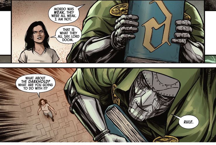 Doctor Doom tiene bastante confianza a pesar de las advertencias de Sofia Strange (la hija de Doctor Strange). Aunque el Darkhold es famoso por ser una fuerza impredecible y corruptora, Doom cree que puede aprovechar su poder mejor que cualquiera de los otros que han poseído el libro en el pasado. Si bien esto es parte del curso considerando el gran ego y orgullo de Doom, es uno de los magos más fuertes y poderosos del Universo Marvel. ¿Quizás pueda doblegarlo a su voluntad?