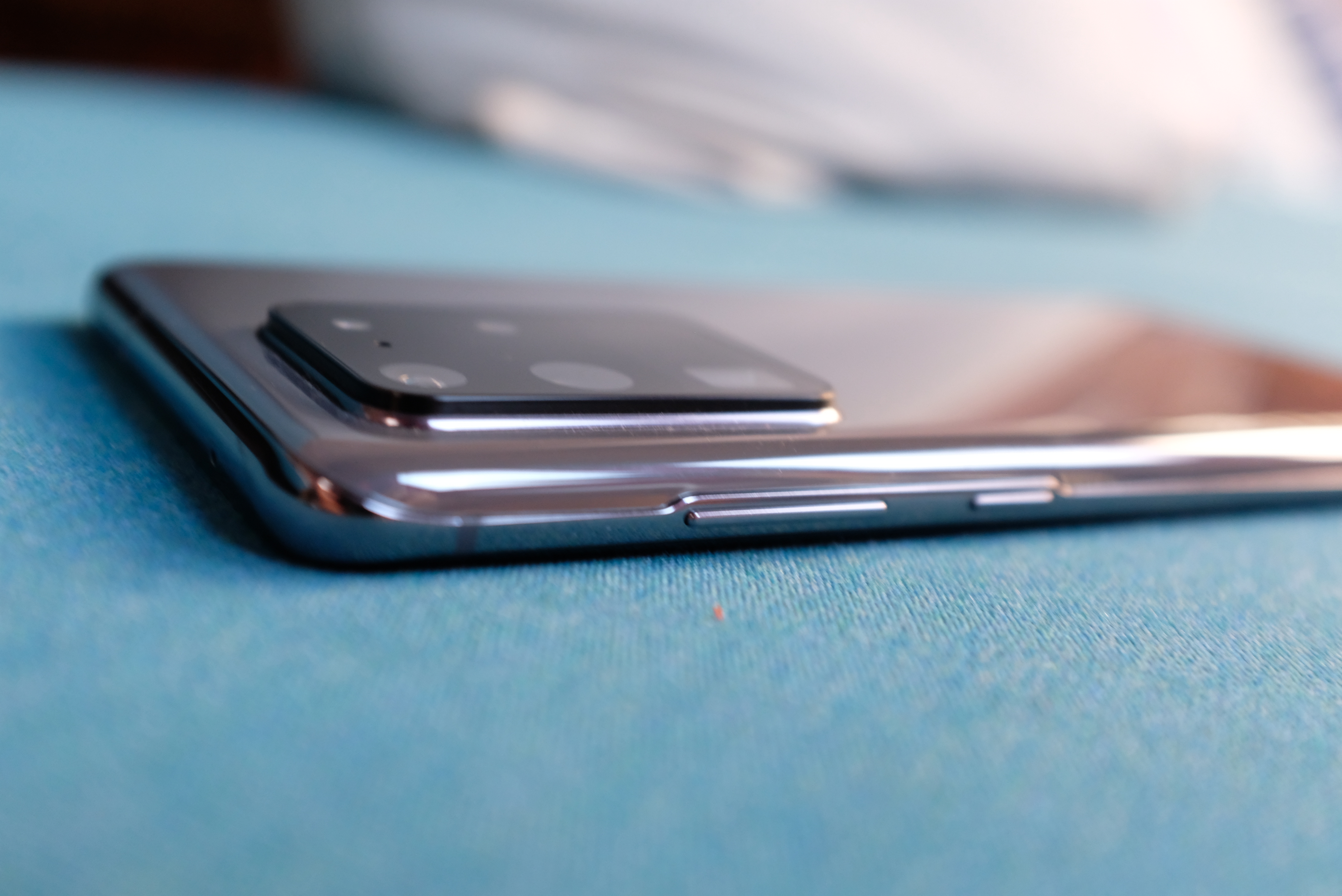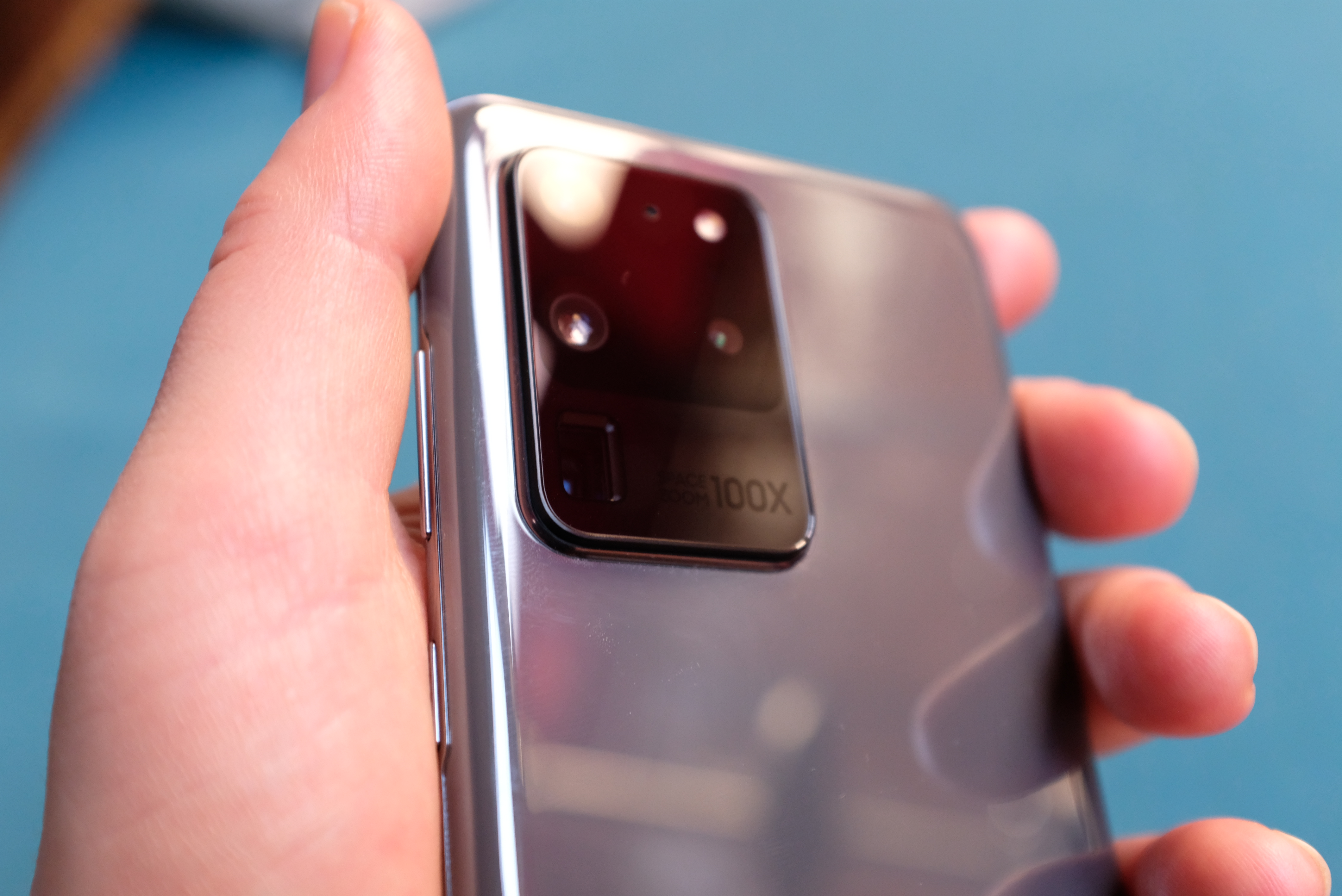El lenguaje de diseño es bastante idéntico en los tres S20 y, sinceramente, en gran medida sin cambios con respecto al modelo del año pasado, aunque Samsung se ha movido a una cámara perforadora (un generoso 40 megapíxeles para selfies) en la delantera. Dale la vuelta y la mayor diferencia es evidente de inmediato. El módulo de cámara en el Ultra es, bueno, ultra. Hay cuatro cámaras allá atrás, en un borde que ocupa aproximadamente un sexto de la superficie total del teléfono.
