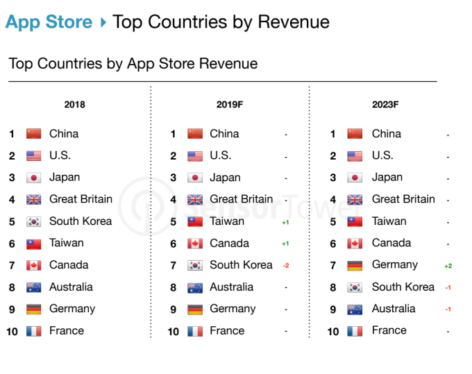 Sensor Tower también estima que los EE. UU. Pasarán brevemente a China en los ingresos de la App Store para 2020, una cifra que se relaciona con las menores ventas de iPhone de Apple en China, lo que lo llevó a reducir su pronóstico de ingresos. China también se vio sustancialmente afectada por la congelación de licencias de juegos, que vio cómo las descargas de aplicaciones cayeron un 4 por ciento entre 2017 y 2018, después de haber crecido un 8 por ciento el año anterior. El gasto del consumidor entonces creció solo un 14 por ciento en 2018, frente al 60 por ciento del año anterior.