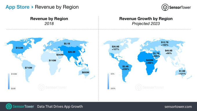 Otra tendencia en el nuevo pronóstico es el crecimiento proyectado para los mercados emergentes. África y América Latina registrarán el mayor crecimiento de ingresos en los próximos cinco años, con el primero preparado para un crecimiento del 296 por ciento a $ 420 millones en la Apple App Store para 2023 y el último con un crecimiento del 239 por ciento a $ 2.4 mil millones.