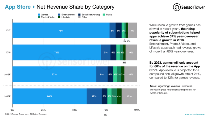 Gracias a las suscripciones y a la categoría de Entretenimiento (por ejemplo, aplicaciones de transmisión por secuencias), el crecimiento de los ingresos en aplicaciones que no son de juego en iOS (24 por ciento) pasará a un crecimiento de los ingresos en juegos (10 por ciento) en los próximos cinco años. Esto llevará a que las aplicaciones que no son juegos representen el 40 por ciento de los ingresos de la App Store en 2023, o $ 38.8 mil millones.