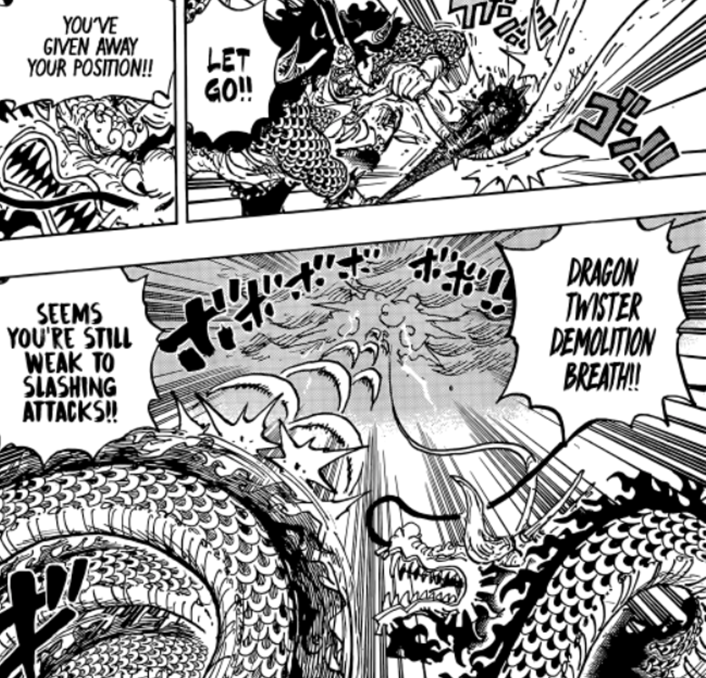 En medio de la batalla, Kaido envió a Luffy a volar hacia la azotea de Onigashima, pero el poder del Gear Fifth para convertir los alrededores de Luffy en goma hizo que rebotara en el cielo. Aunque estaba casi inconsciente, Luffy se aferró a Kaido mientras volaba. Kaido afirmó que este movimiento sólo había revelado la posición de Luffy en el cielo y gritó diciendo que, a pesar de su nuevo poder, Luffy es débil a los ataques cortantes.. Kaido luego aprovechó esta oportunidad para enviar una ráfaga de cortes al aire, nombrando el ataque, “Dragon Twister, Aliento de demolición.”