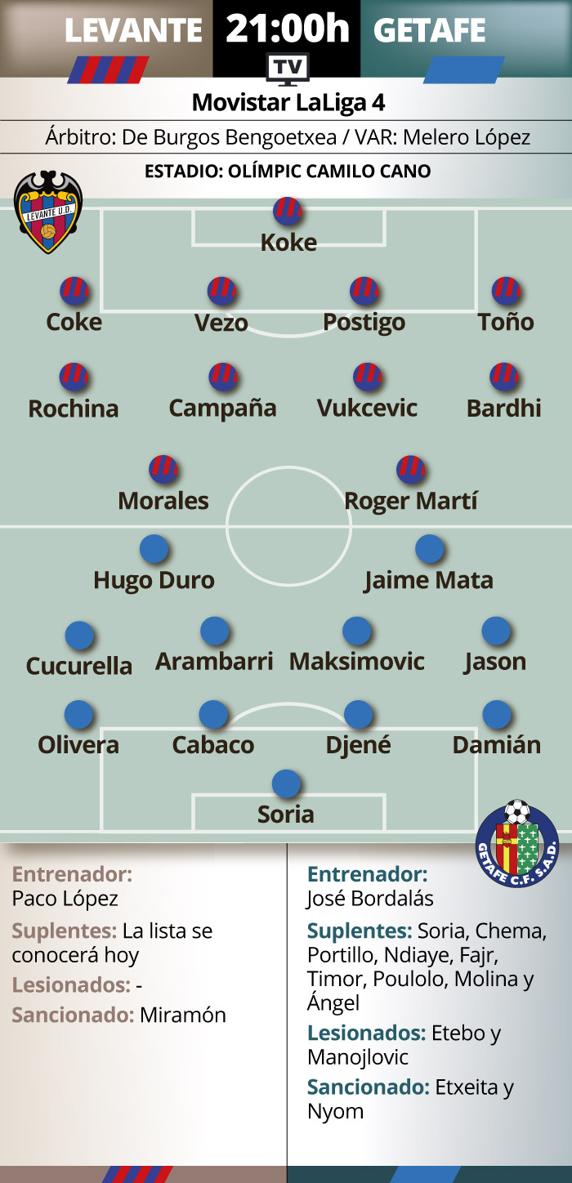 El Levante recibe este domingo en La Nucía al Getafe sin nada en juego, mientras que el equipo de José Bordalás depende de sí mismo para clasificarse para la Liga Europa y con una victoria mantendrá la séptima plaza de la clasificación o incluso podría avanzar un puesto.