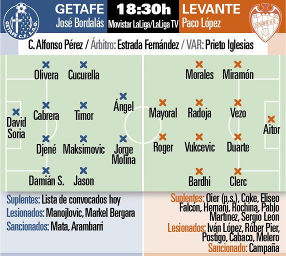 La ausencia de Jaime Mata permitirá a Ángel Rodríguez jugar arriba junto a Jorge Molina, mientras que el marroquí Fayçal Fajr y David Timor pelearán por ocupar el hueco de Arambarri en el centro del campo al lado del serbio Nemanja Maksimovic.