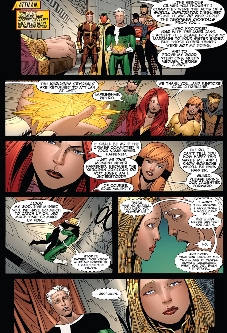 Eventualmente, Quicksilver hizo una confesión completa en televisión sobre sus mentiras y admitió sus errores y engaños (en Factor X totalmente nuevo n.º 12, de Peter David y Carmine Di Giandomenico), lo que hizo que Luna finalmente lo perdonara, pero el tiempo que pasó con un terrible secreto fue uno de sus mejores trabajos de personaje hasta la fecha. Quicksilver es uno de los superhéroes más complejos de Marvel, carga con un trauma inmenso y traspasa los límites del estereotipo del ‘antihéroe’. Si bien su doppelganger de MCU fue una decisión inspirada en Wanda Visionla revelación de Azogue En realidad, no ser secuestrado por los Skrulls fue un giro increíble que sacó lo mejor de su personaje.