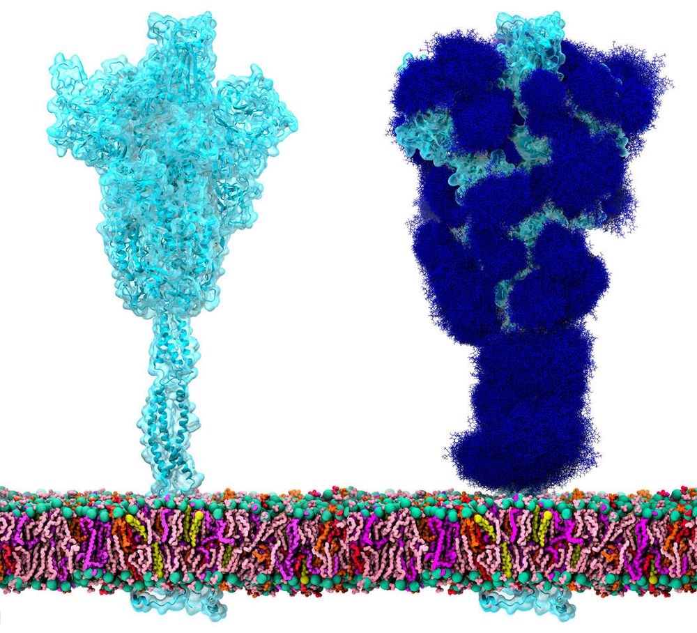 Aproximadamente un 70% de toda la superficie de la proteína espícula está recubierta de glicanos, tal y como demuestra un estudio liderado por Rommie Amaro, de la Universidad de California en San Diego. “Los azúcares escapan a lo que podemos ver bajo el microscopio”, explica Amaro. Existen técnicas, como la microscopía crioelectrónica, capaces de “congelar” las biomoléculas para poder observarlas. “Pero los azúcares se mueven demasiado rápido para poder verlos con esta tecnología”, añade. Por eso, los investigadores decidieron utilizar simulaciones por ordenador para reconstruir el glaseado que recubre a la proteína espícula, y así entender su papel durante la infección.