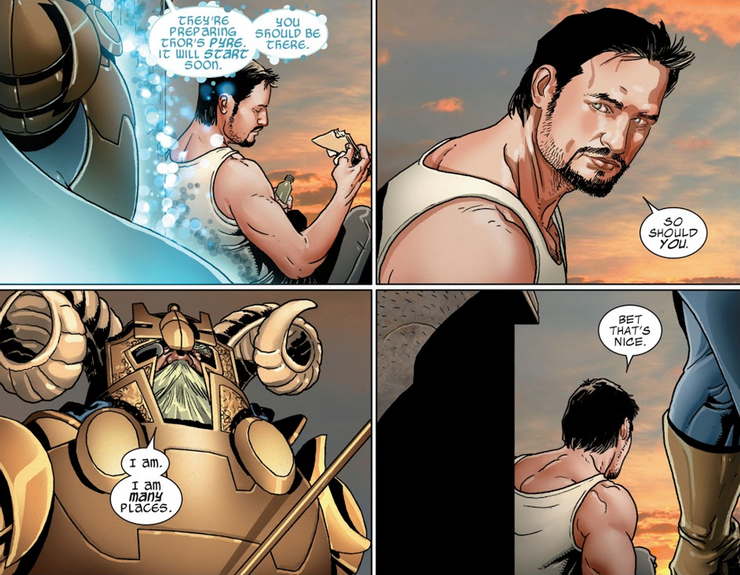 La última habilidad olvidada de Odin se presenta en Matt Fraction y Salvador Larroca. Miedo en sí mismo #7.3: Iron Man. Odin viaja a París para visitar a Tony Stark y le dice que la pira funeraria de Thor está a punto de encenderse. Enojado por las travesuras que Odin hizo el día anterior, Tony le dice abruptamente a Odin que debería estar de vuelta en el funeral de Thor, a lo que Odin responde: “Yo soy. Estoy en muchos lugares. Le da una conferencia a Tony sobre cómo ha visto el mundo renacer miles de veces, dándole al héroe un breve vistazo de lo pequeño que es frente al cosmos. Mientras que Odin finalmente usa sus poderes para curar a la gente de París, que se convirtió en piedra durante El propio miedo, a pesar de los mejores esfuerzos de Iron Man: es su capacidad para estar en varios lugares a la vez lo que realmente muestra por qué el reinado de Thor ha sido tan terrible.