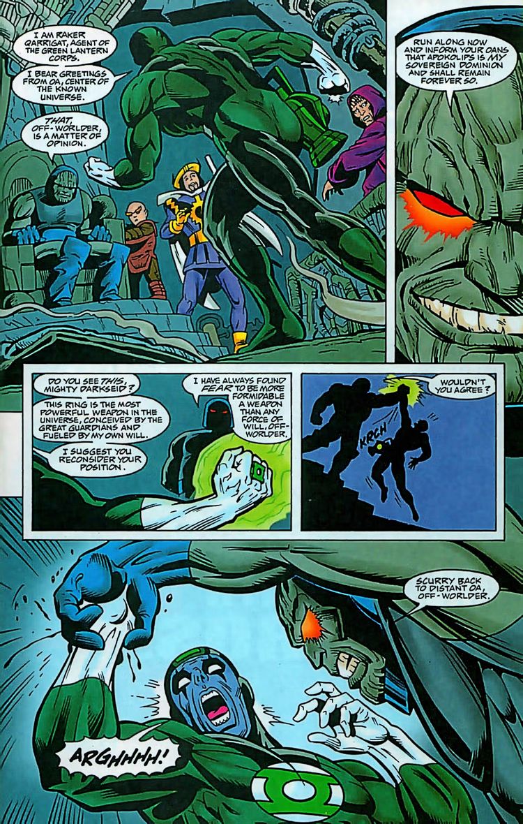 Linterna Verde gigante de 80 páginas El número 3, de Scott Beatty y Graham Nolan, presentó a los lectores la primera pelea entre Darkseid y un Linterna Verde. Después de que Darkseid humillara por completo a Raker Qarrigat, Raker regresó a Apokolips con un ejército de Linternas Verdes para intentar liberar el planeta. Después de una larga batalla, parecía que las fuerzas de Raker habían tomado la delantera, solo para que los Guardianes del Universo cancelaran el ataque.