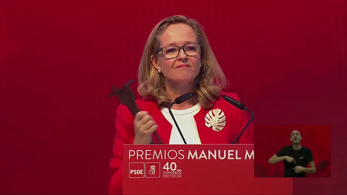 Emocionada al recibir el premio Manuel Marín con Anne Hidalgo, la alcaldesa de París; Javier Lambán, presidente de Aragón, y Ángel Víctor Torres, presidente de Canarias, Calviño, hija del que fuera director de la primera RTVE bajo el mandato de Felipe González, se reivindicó de “familia socialista”. “Estoy emocionada porque este es un premio del PSOE. Soy de familia socialista. Este partido ha estado conmigo toda mi vida. He descubierto recientemente que yo estaba, con ocho años, en la foto de la primera campaña electoral agarrando una rosa. Ese compromiso me llevó a aceptar la propuesta del presidente Sánchez en 2018″, ha explicado. Después ha admitido que ella era una gran desconocida para todos los socialistas: “Todos me acogisteis sin conocerme en absoluto”. Y ha rematado ya con la voz casi quebrada: “Soy de familia republicana. Solo tengo la pena de que no vivan mis abuelos para verme como vicepresidenta de un Gobierno socialista”.