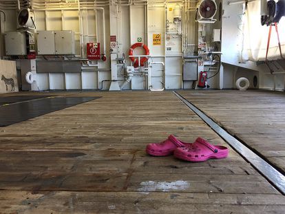 Unos zuecos de goma de color rosa han quedado en medio de la cubierta donde Grace, de 25 años, ha compartido espacio con una compatriota a la que conoció durante la travesía, Osas, de 21 años. Por primera vez desde hacía tiempo decían sentirse a salvo. Aunque no se conocían su historia es parecida. “Alguien” llevó a Grace de Nigeria a Libia. -¿Un familiar? “No sé, alguien”-. Estuvo dos años trabajando en una casa donde la maltrataban. Dice que se escapó y no da más detalles. “Libia no es bueno”, señala mientras baja la mirada antes de que Osas tome la palabra. “Yo igual, estuve un año y tres meses”, dice. También escapó. No da detalles ni de cómo llegó de Nigeria al país magrebí, ni de cómo acabó en un bote en el mar.