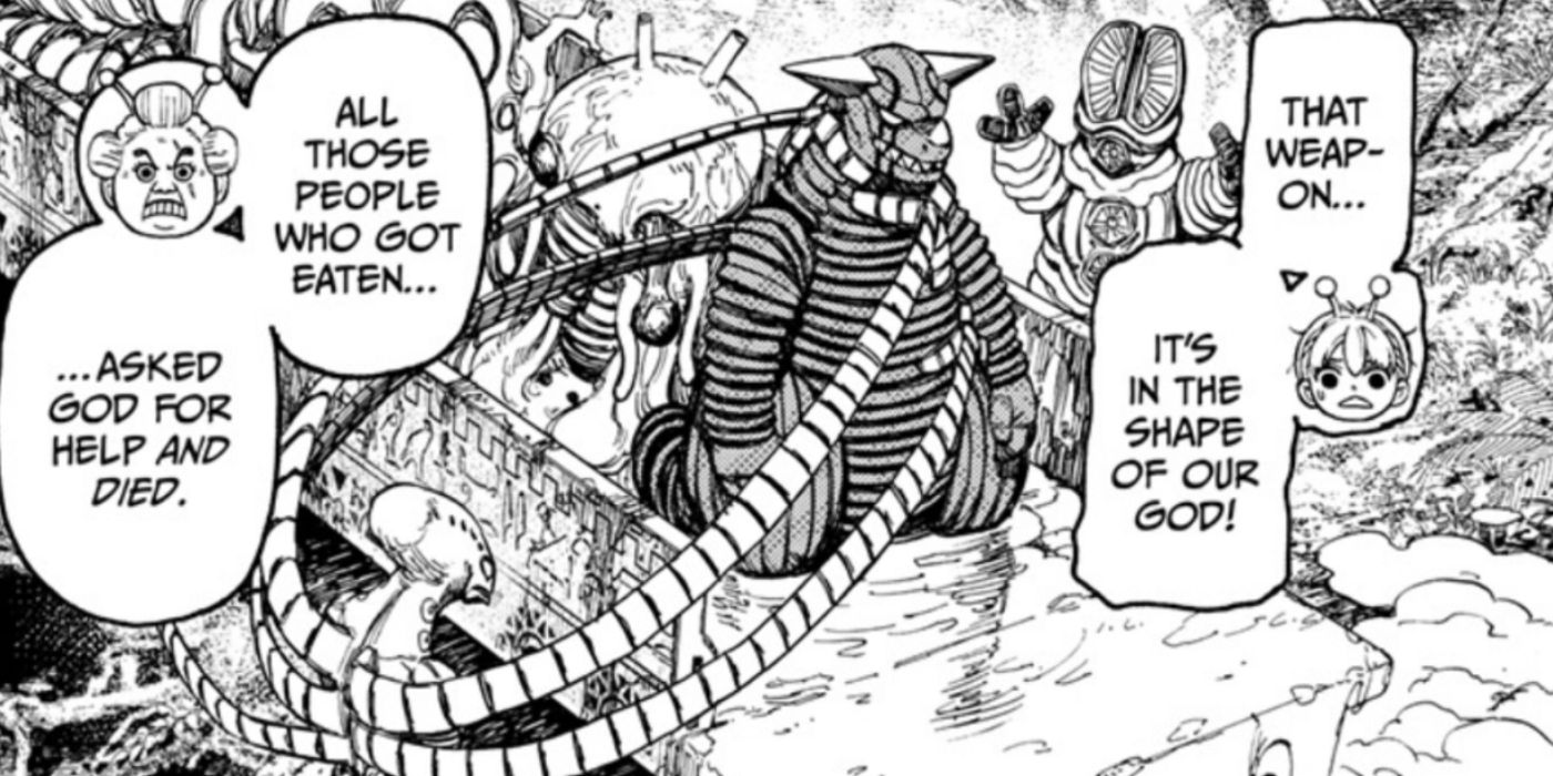 La importancia de cómo surgió este traje de kaiju es más convincente si se considera que en el capítulo anterior, una Vamola mucho más joven se entera de que el dios de su pueblo es un kaiju que, según se dice, aparece cuando los sumerios están al borde del desastre. En otras palabras, el dios que está destinado a salvar a los sumerios nació de sus cadáveres. El salvador de los sumerios se hizo a partir de las dolorosas muertes de los sumerios que no pudo salvar. También es irónico que el kaiju esté destinado a salvar a su gente de lo que lo dio a luz (es decir, Big Mama). Esta es una buena imagen, especialmente cuando se considera el hecho de que Vamola usa el traje más adelante, lo que es similar a pilotar el producto de la dolorosa desaparición de su gente.