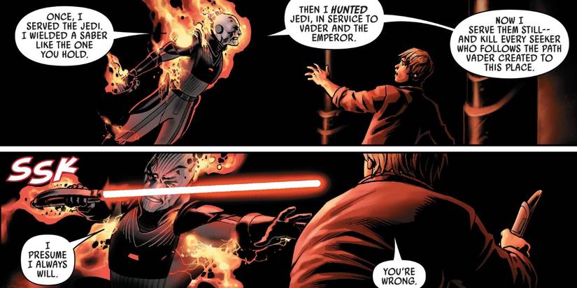 Como se revela en el cómic canónico de Marvel La guerra de las galaxias #6 por Charles Soule y Jesús Saiz, Luke Skywalker activa una trampa del lado oscuro cuando explora un puesto avanzado Jedi abandonado poco después de los eventos de El imperio ContraatacaEsto hace que el joven Jedi se enfrente al espíritu corrupto del mismísimo Gran Inquisidor, aún ardiendo por su ardiente muerte en Rebeldes de la Guerra de las GalaxiasFinalmente, se reveló después de la victoria y el escape de Luke que el El espíritu del Gran Inquisidor había sido efectivamente maldecido y atado a este puesto avanzado por Darth Vader para servir como una trampa viviente para cualquiera que buscara conocimiento de los Jedi.