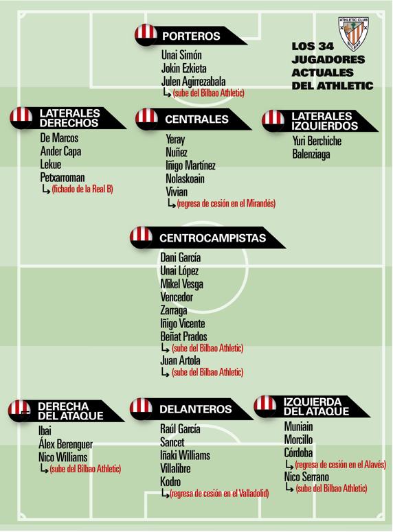Las intenciones del actual inquilino del banquillo de San Mamés nos llevarían a una cifra de 22 futbolistas, pero en este momento hay 34 después de que el club hiciera público en la tarde del lunes los cinco cachorros que harán la pretemporada con el primer equipo a partir del 7 de julio, día en el que todos los jugadores están citados en las instalaciones de Lezama para dar comienzo a la fase de preparación del curso próximo, nuevamente con tres competiciones en juego, Liga, Copa y Supercopa.