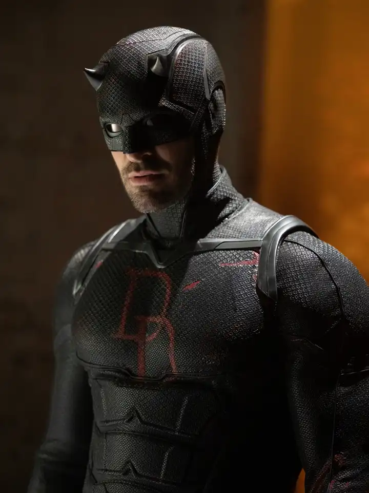 Temerario aparece en Daredevil: Nacer de nuevo Temporada 2 con su disfraz ya pintado de negro, donde los únicos detalles en rojo son los lentes de su capucha y la iteración del cómic de la icónica insignia en el pecho doble D del personaje. Sabemos que gradualmente sufrirá daños de batalla por desgaste, exponiendo más del rojo que estaba pintado.