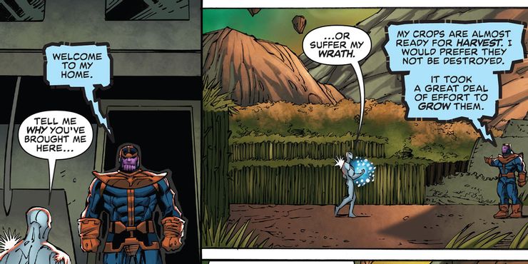 En Silver Surfer: Renacimiento #2 por Ron Marz, Ron Lim, Don Ho, Israel Silva y Joe Sabino de VC, los lectores regresan a la granja de Thanos vista desde el original Guantelete infinito series y otras aventuras cósmicas. Es allí, Thanos le revela su hogar a Silver Surfer y le dice al héroe que sus cultivos están casi listos y que “requirió un gran esfuerzo” para cultivarlos. El cómic muestra el lado más humano de Thanos y presenta el paraíso que buscó tras derrotar a los Vengadores.