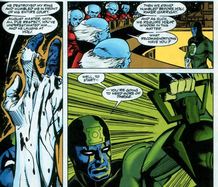 Al enterarse de un Green Lantern perdido que una vez desafió a Darkseid, Orion y Kyle Rayner viajan a New Genesis para aprender más. Lamentablemente, Desaad, el esbirro de Darkseid, los intercepta. Debilitados y tratando de escapar, la pareja se encuentra con este Lantern olvidado hace mucho tiempo, Raker Qarrigat, quien les cuenta su historia. Raker había viajado a Apokolips cuando solo había un pequeño puñado de Linternas Verdes patrullando el universo. La linterna olvidada se había enfrentado a Darkseid, alegando que su anillo es el arma más poderosa del universo. En respuesta, Darkseid aplastó el anillo y rompió la mano de Raker en el proceso.
