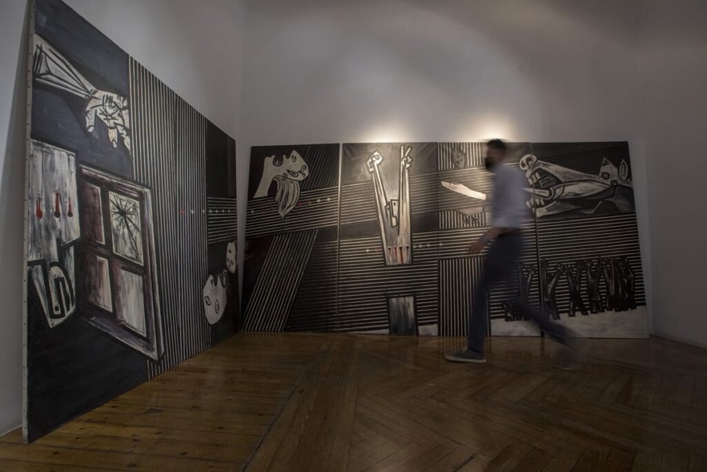 Ibarrola (Basauri, 90 años), que lleva algunos años retirado de la vida pública, actualizó la reivindicación y la protesta que, 40 años antes, Picasso había impreso en su cuadro. Era 1977 y el artista vasco, que ya había incluido motivos del Guernica en una serie de estampas, volvió a esta obra para crear en 10 paneles una nueva versión. En este gran mural, que “juega a serlo sin serlo, y por lo tanto se asigna el valor de monumento”, afirma Rocío Robles Tardío, historiadora y autora del texto que acompaña la presentación de la obra, se identifican con claridad elementos del original combinados con personajes y motivos de la lucha obrera que también atravesaron la obra del artista vasco.