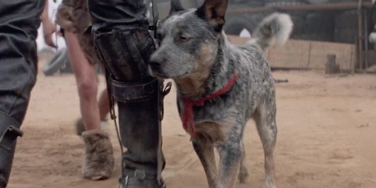 Aunque viaja solo a raíz de los asesinatos de su esposa e hijo, Max tiene un compañero canino en las primeras escenas de El guerrero de la carretera. La mascota de Max, Blue Heeler, se sienta en su asiento del pasajero, llenando el vacío emocional dejado por los asesinatos de su familia. A mitad de camino El guerrero de la carretera, este perro es asesinado por un Merodeador con una ballesta.