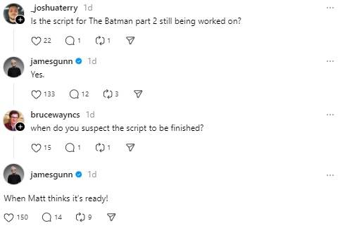 - El jefe de DC Universe, James Gunn, confirma que el guión de The Batman – Part II aún está en progreso, sin una fecha de finalización establecida aún.