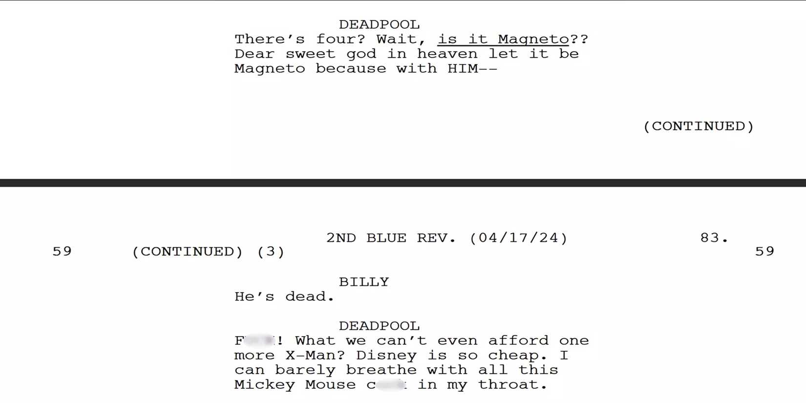 Gracias al guión ahora disponible públicamente (a través de Disney Debut), ahora sabemos exactamente cuál fue el chiste y por qué Disney se negó a incluirlo. En el intercambio entre Blade de Wesley Snipes (llamado Billy en el guión para ocultar su identidad) y Wade, en el que Deadpool se entera de que Magneto ya está muerto, su reacción original incluía una referencia explícita a Mickey Mouse: