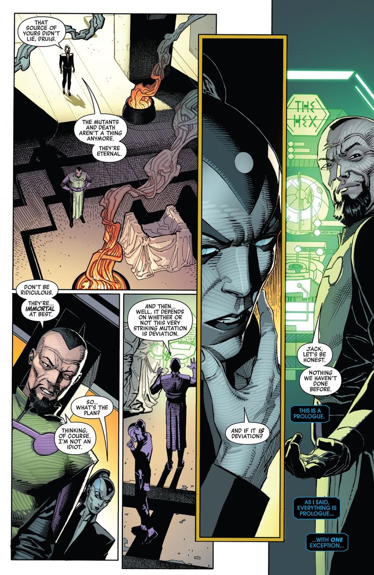 La mayor revolución realizada por el escritor Jonathan Hickman durante su mandato como autor intelectual de los libros de X-Men fue “quitar la muerte de la mesa para hacerla más interesante.“Los mutantes de Marvel son oficialmente inmortales, ya que cada vez que uno muere, su cuerpo es reconstruido por un grupo llamado los Cinco, y sus mentes, cargadas en Cerebro como respaldo, se descargan en el nuevo recipiente. Por lo asombrosos que pueden ser los Protocolos de Resurrección, los Eternos han tenido algo similar, pero más eficiente, desde su creación hace milenios, gracias a la tecnología Celestial llamada La Máquina, cada vez que un Eterno muere su cuerpo es reconstruido hasta el nivel molecular, pero con un precio terrible a pagar: la vida de un ser humano al azar.
