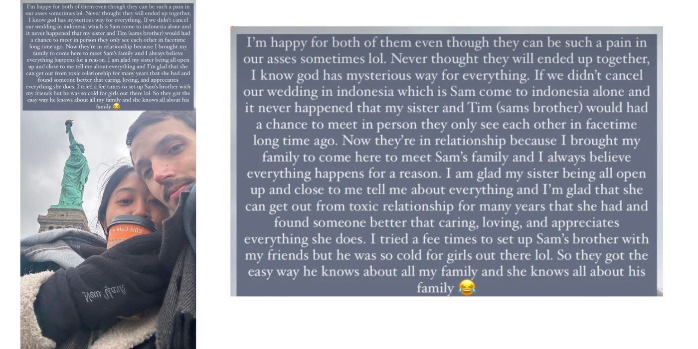 “/> En una historia de Instagram, Citra confirmó que su hermana Nafa se comprometió con el hermano de Sam, Timmy. “Estoy muy feliz por ambos a pesar de que a veces pueden ser un gran dolor para nuestros traseros.”, escribió Citra en su actualización. Admitió que nunca pensó que su hermana y el hermano de Sam terminarían juntos. “Sé que Dios tiene [a] manera misteriosa para todo,” ella añadió.