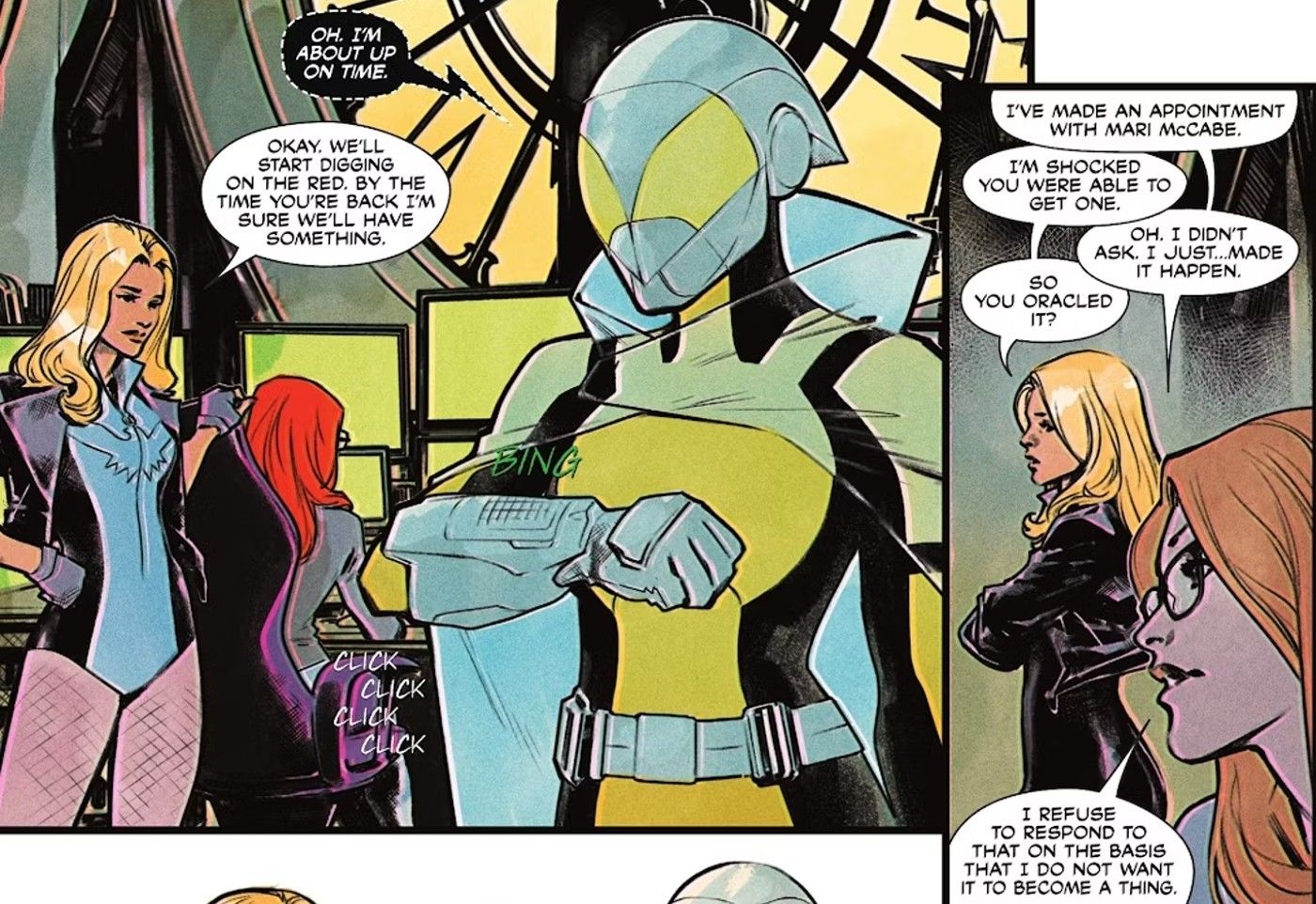 Dinah rápidamente ofrece un eslogan que abarca su imparable habilidad para hacer que las cosas sucedan: “¿Entonces lo oráculoste?” Con sólo unas pocas palabras, capturó la idea de que prácticamente no hay nada que Oracle no pueda hacerseñalando su inmenso pero discreto poder en el DCU.