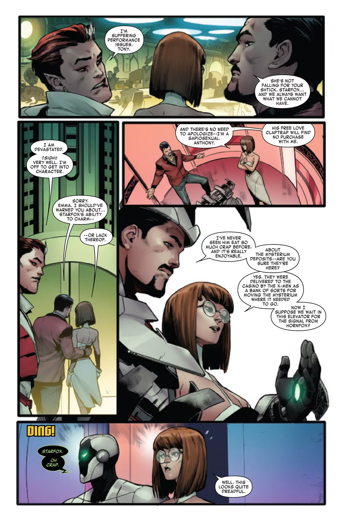 Hombre de hierro invencible El número 13, escrito por Gerry Duggan, con arte de Juan Frigeri, Bryan Valenza y Joe Caramagna de VC, muestra que si bien el matrimonio de Tony Stark y Emma Frost es una alianza en tiempos de guerra, los dos se llevan bastante bien. Cuando Starfox lleva a la pareja a Gameworld para dar un atraco, recurre a Emma, para disgusto de ella y de Tony.