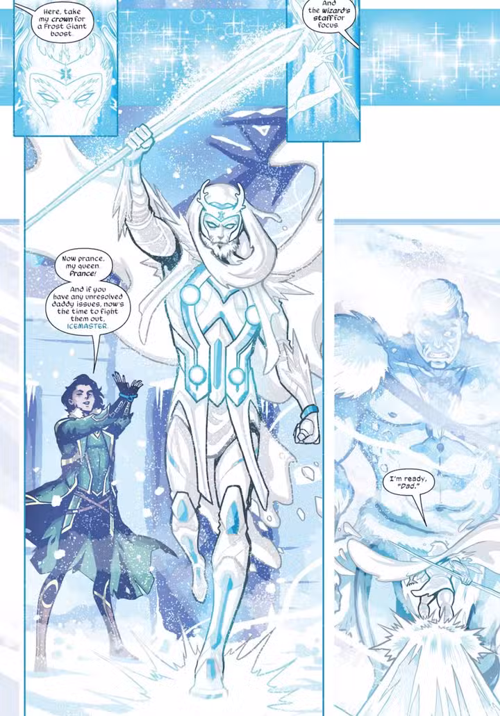 Al principio de la aventura, Iceman hace equipo con Loki contra un enemigo que ha convocado una amalgama de sus padres abusivos. Tomando la corona y el bastón de Loki, Iceman se transforma en el Icemaster parecido a un magoderrocando a su oponente, el Gigante de Hielo, y logrando un cierre de su tensa relación con su propio padre.