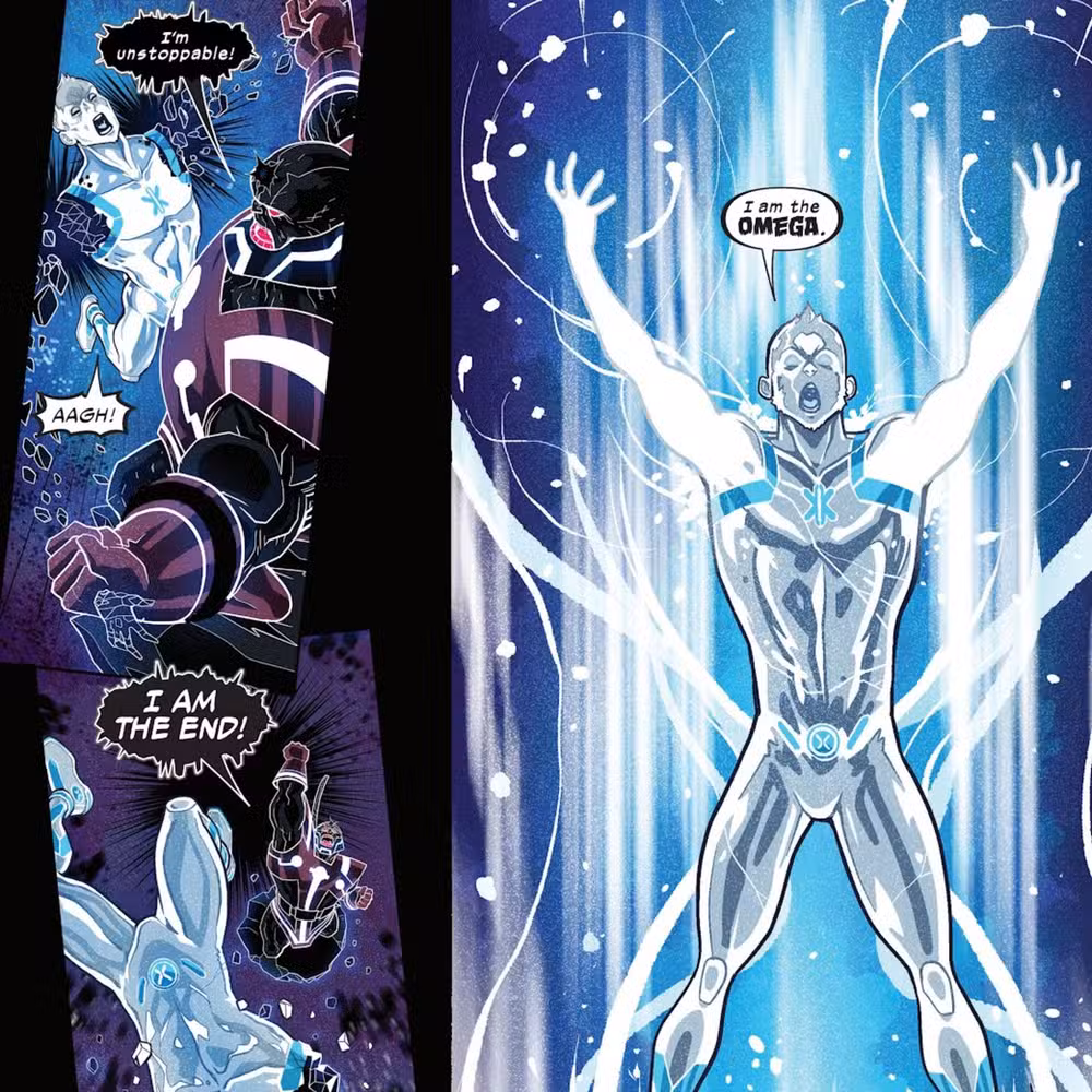 Más adelante en el número, Iceman choca con Terrax, el ex Heraldo de Galactus. El villano cósmicamente poderoso destroza los brazos de Iceman y aparentemente lo da por muerto. Sin embargo, al dominar sus poderes de nivel Omega, Iceman repara instantáneamente sus extremidades faltantes.