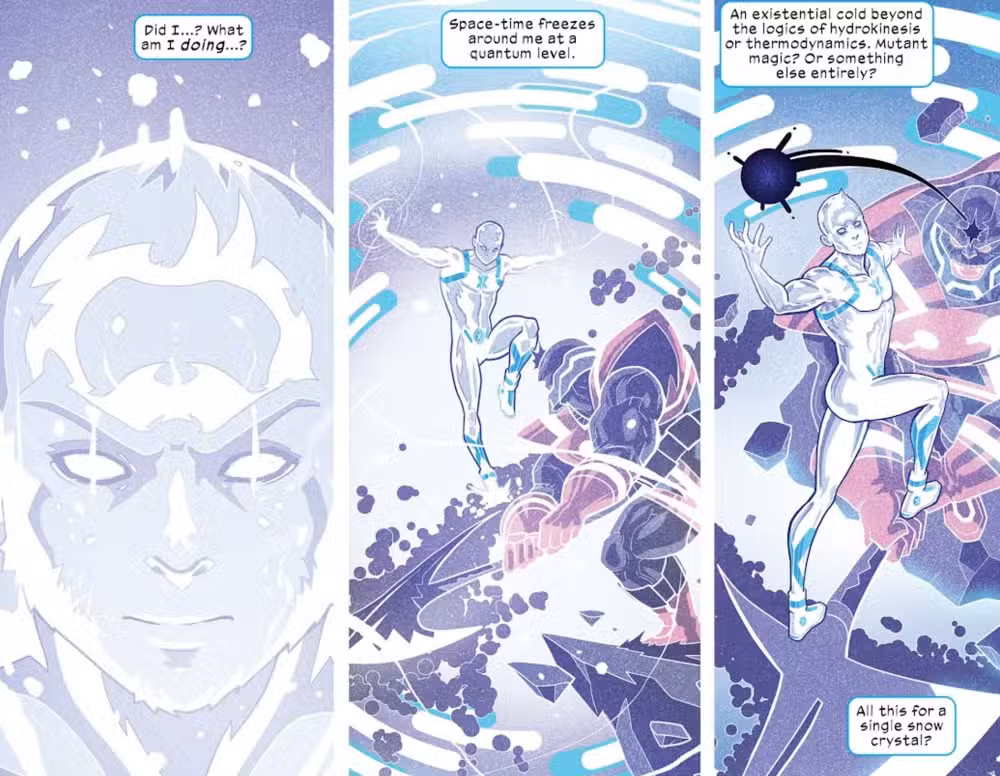 Este es el momento en que Bobby Drake comprende completamente que no está atado a su cuerpo físico: su forma de hielo es una construcción creada por su mente y puede crecer, encogerse, curarse o deformarse según sus deseos.