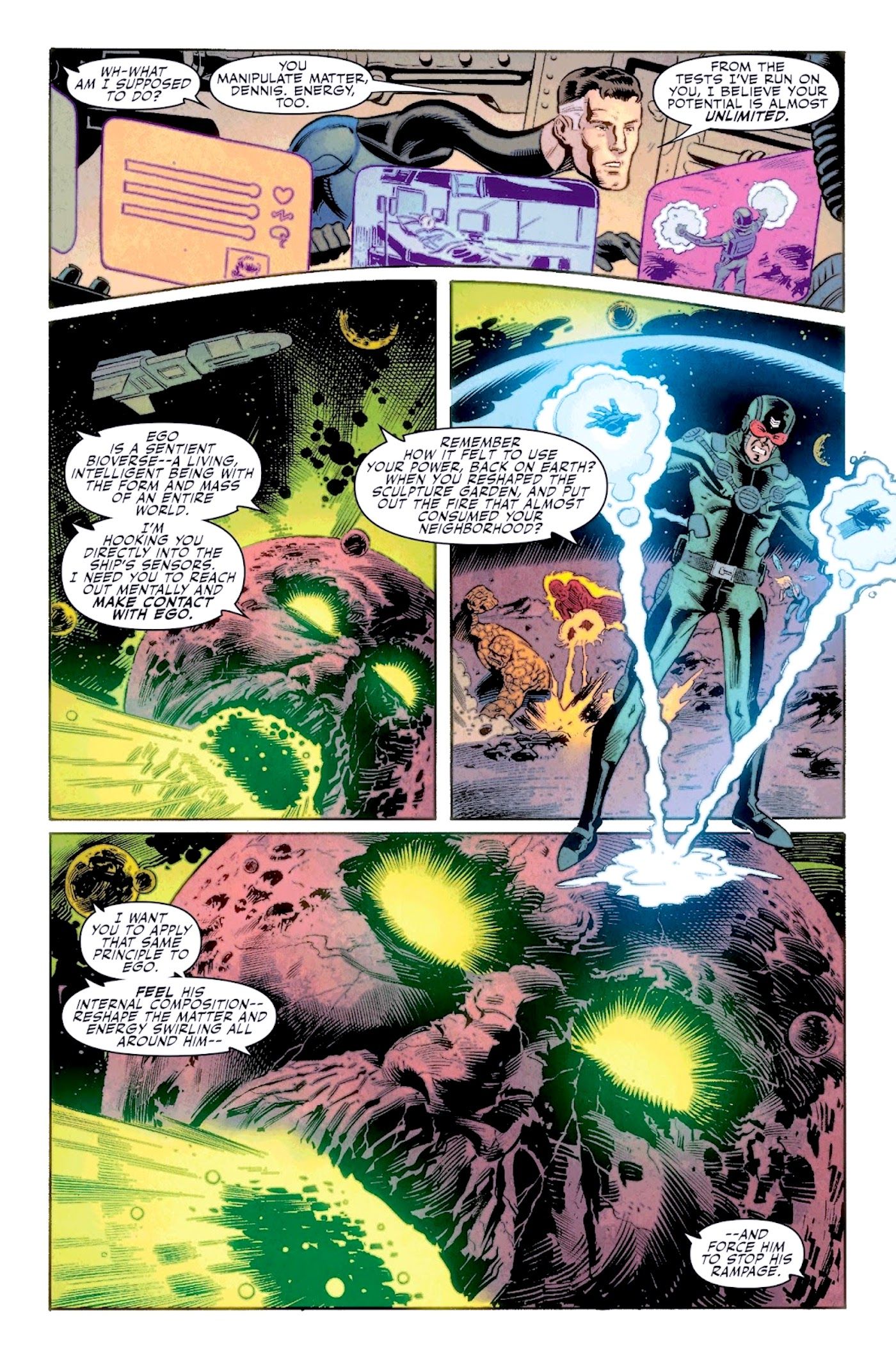 Reed le informa a Dennis que descubrió un cáncer agresivo en el curso de su examen, lo que le da a Dennis un pronóstico de tener un mes de vida. Después de que Reed Richards se entera de los nuevos poderes de Dennis, explica cómo su habilidad para alterar la materia no tiene límite, lo que lo hace más poderoso de lo que pueden imaginar. Los Cuatro Fantásticos solicitan la ayuda de Dennis para evitar que Ego the Living Planet destruya la galaxia. Ego se está tragando estrellas a un ritmo tan rápido que pronto consumirá toda la galaxia. Dennis, al que Sue Storm le dio el nombre en clave Flux, altera la energía y la materia que Ego ha consumido, volviendo todo a la normalidad.