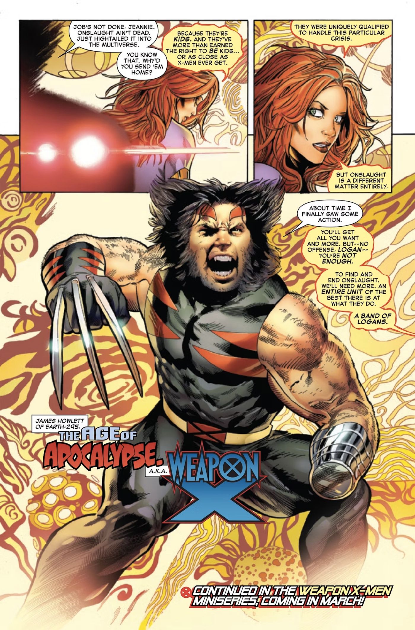 Jean no quiere luchar directamente por miedo a que Onslaught absorba sus poderes y se vuelva verdaderamente imparable. Por lo tanto, necesita un equipo que sea el mejor en lo que hace: un equipo multiversal de Wolverines. Esta historia establece el mes de marzo. Arma X-Men miniserie, donde James Howlett de Tierra-295 forma un equipo de sus variantes en todo el multiverso para manejar Onslaught. Ahora que el Fénix sabe lo que X Men Realmente están peleando, ella no necesita parar. Hombre de Acero primero.