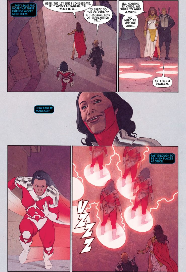 Para los lectores de DC que pueden no estar familiarizados con los ex alumnos de Marvel, Makkari es miembro de los Eternos, un grupo de superhumanos parecido a Dios. Entre sus habilidades más notables está su súper velocidad. Se ha visto que es lo suficientemente rápida como para crear ciclones simplemente corriendo en el lugar y también puede correr sobre el agua, pero la muestra más impresionante de su velocidad se ve en eternos #10 por Kieron Gillen y Esad Ribic. En él, se necesitan seis personas para un ritual para hablar con los Celestiales, pero, por desgracia, seis personas no están presentes. Sin embargo, quien está presente es Makkari, que es lo suficientemente rápida como para parecer que puede estar literalmente en seis lugares a la vez, engañando a la todopoderosa tecnología celestial.