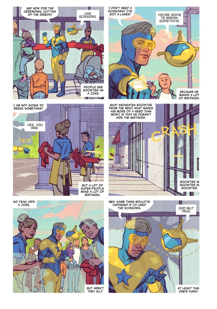 En El objetivo humano # 3 por Tom King, Greg Smallwood y Clayton Cowles, Christopher Chance e Ice investigan quién quería matar a Lex Luthor y verifican a Booster Gold. Conocen al héroe en Booster Bagels, su nueva empresa comercial. Cuando Chance ve a Booster Gold, hace un monólogo sobre cómo el héroe del siglo 25 logró convertirse en el héroe que siempre quiso ser yendo al pasado. Mientras el miembro de la Liga de la Justicia Internacional corta la cinta de su nueva tienda, Chance revela a los lectores que la gente considera que Booster es una broma porque comete muchos errores. Señala que la verdad brutal es que la mayoría de los héroes cometen errores, pero lo que separa a Booster Gold de ellos es que es una broma, pero al menos es divertida.