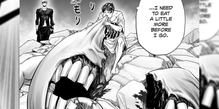 Pig God, sin embargo, tiene una forma diferente de lidiar con este problema: mientras está sentado allí en su cuerpo de tamaño promedio, lentamente se come el cadáver de un monstruo poco a poco. Demuestra algunas cosas impactantes sobre sus poderes, y la más destacada es que no confiaba en su tamaño para devorar criaturas tan grandes. Además, indica que comer ahora seguirá siendo útil en el momento, que podrá aumentar de volumen lo suficientemente rápido como para ayudar más. También parece que Fubuki pudo haber redirigido parte de su masa para salvar la vida de Tanktop Master, ya que se demostró que Tanktop Master era mucho más gordo cuando reapareció.